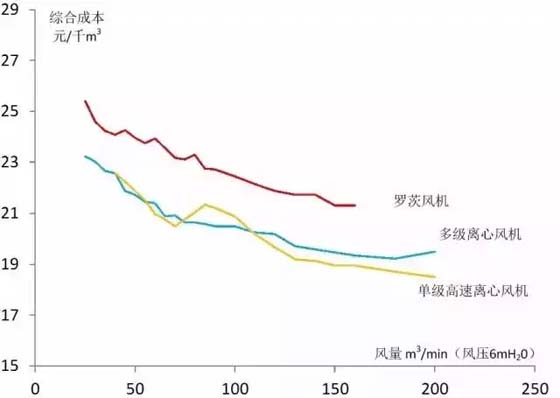 綜合考慮,在小流量范圍內(nèi)羅茨風(fēng)機(jī)具有價(jià)格優(yōu)勢(shì),在中流量范圍內(nèi),多級(jí)離心風(fēng)機(jī)性價(jià)比較好,高流量時(shí),單級(jí)高速離心風(fēng)機(jī)綜合成本最低。在實(shí)際選型中還要考慮流量調(diào)節(jié)的需求、安裝條件以及運(yùn)行維護(hù)方便性等因素。